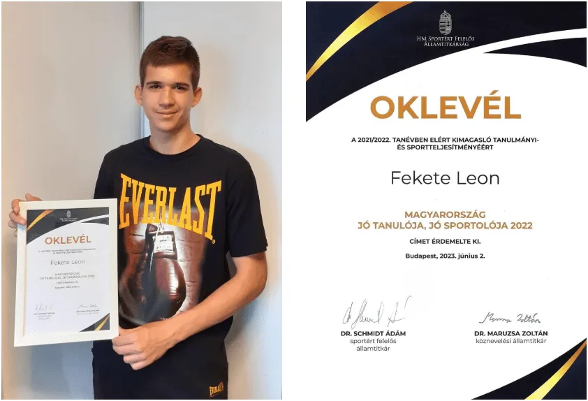 Dr. Schmidt Ádám sportért felelős államtitkár a Magyarország jó tanulója, jó sportolója oklevéllel jutalmazta Fekete Leont.